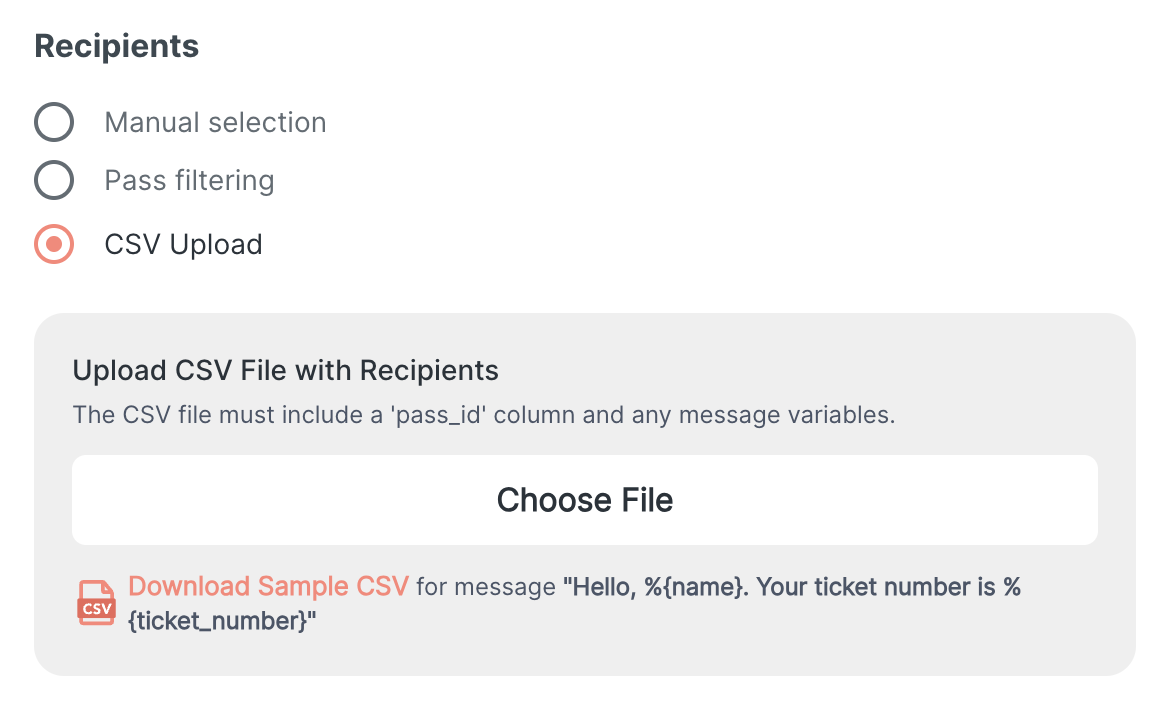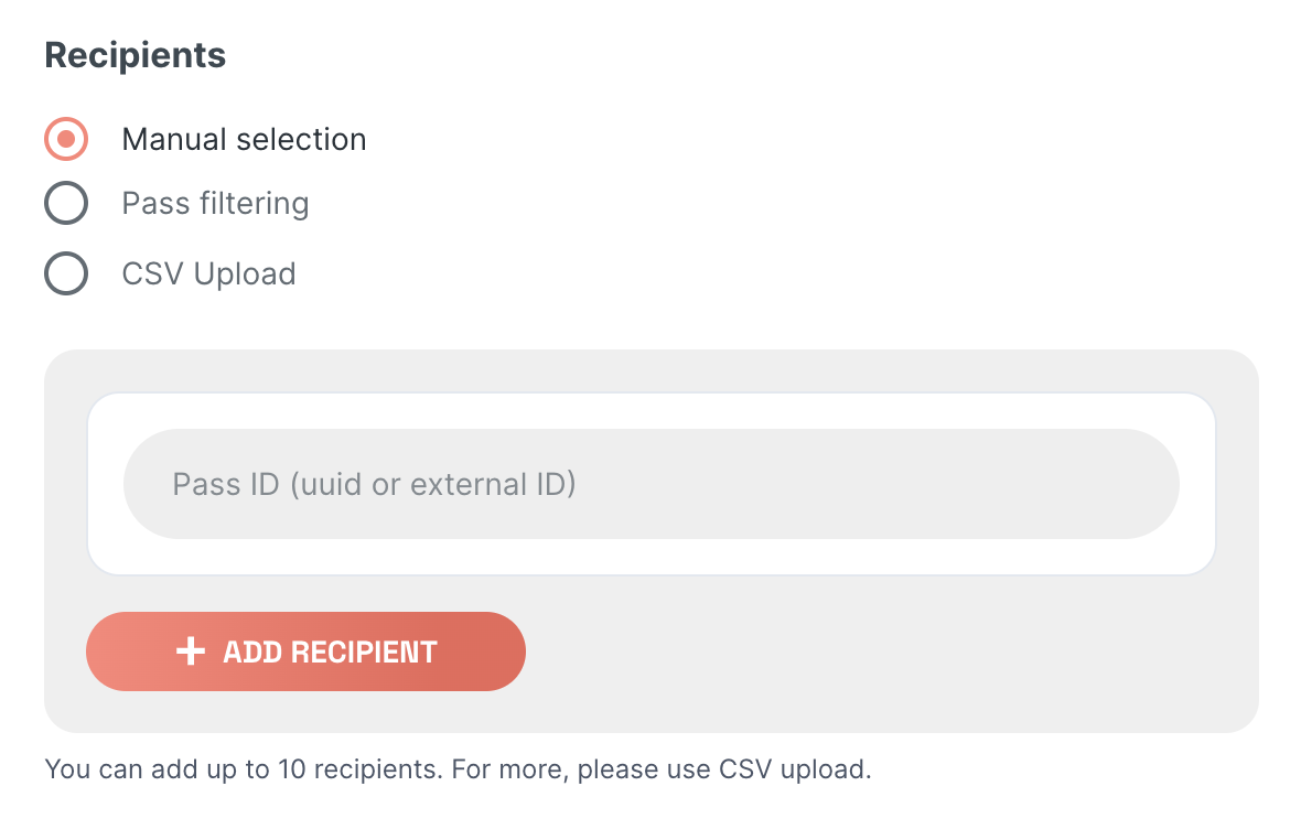 There are three ways to define recipients for your message:- Pass IDs. Manually enter the pass UUID or external ID for each recipient, along with any variables needed for the message. You can add up to 10 recipients via the frontend, with 500 recipients limit when using the API.