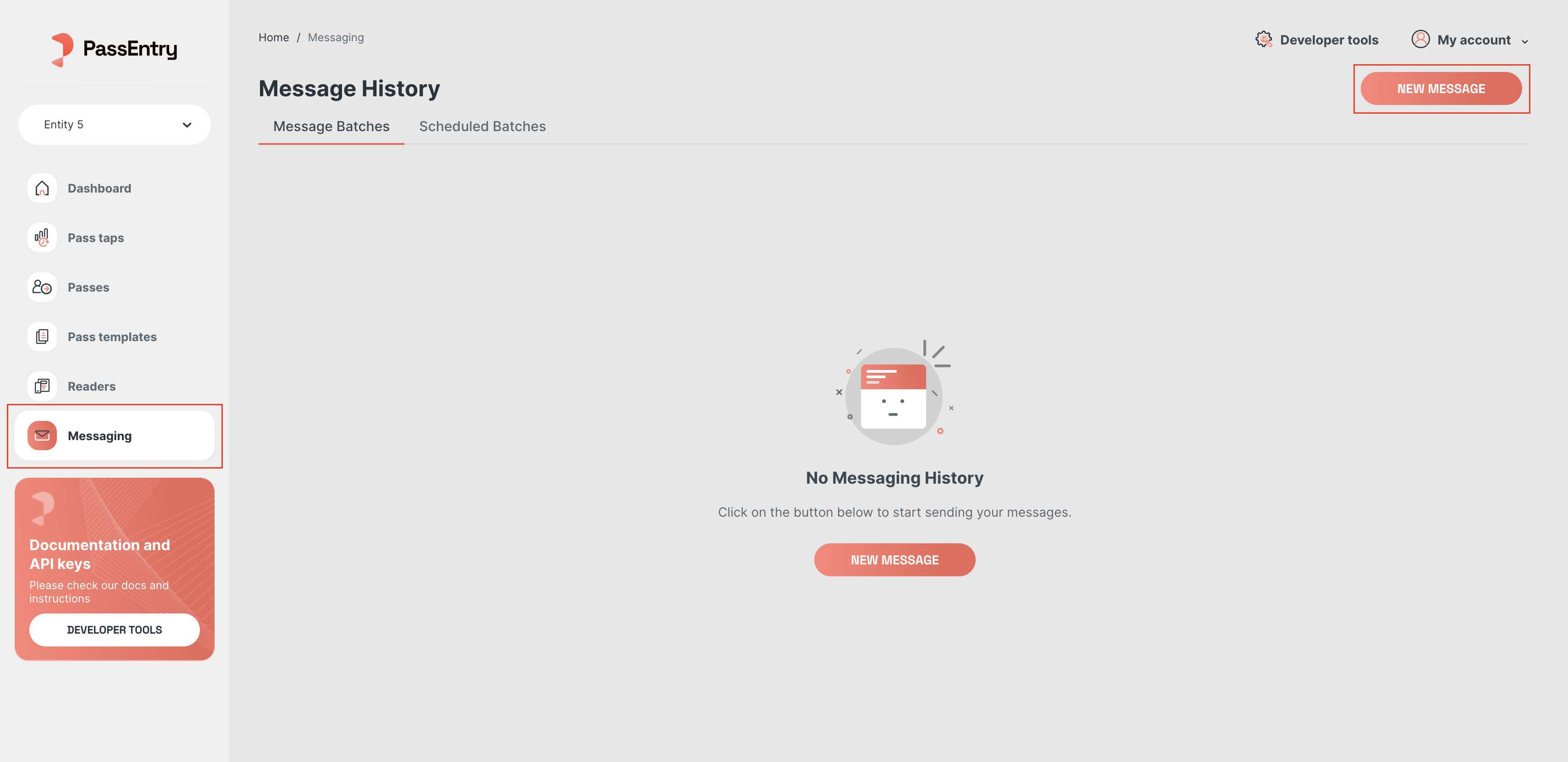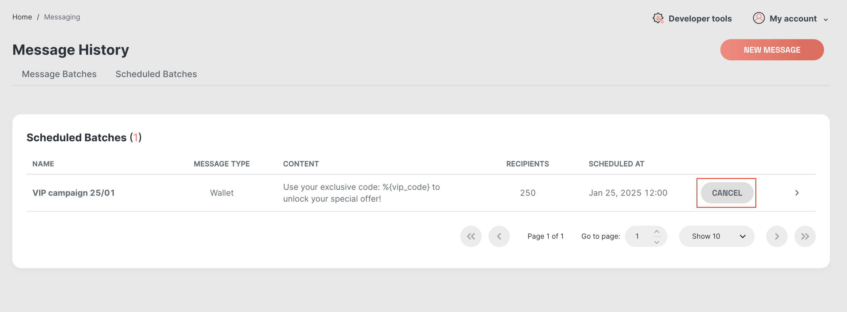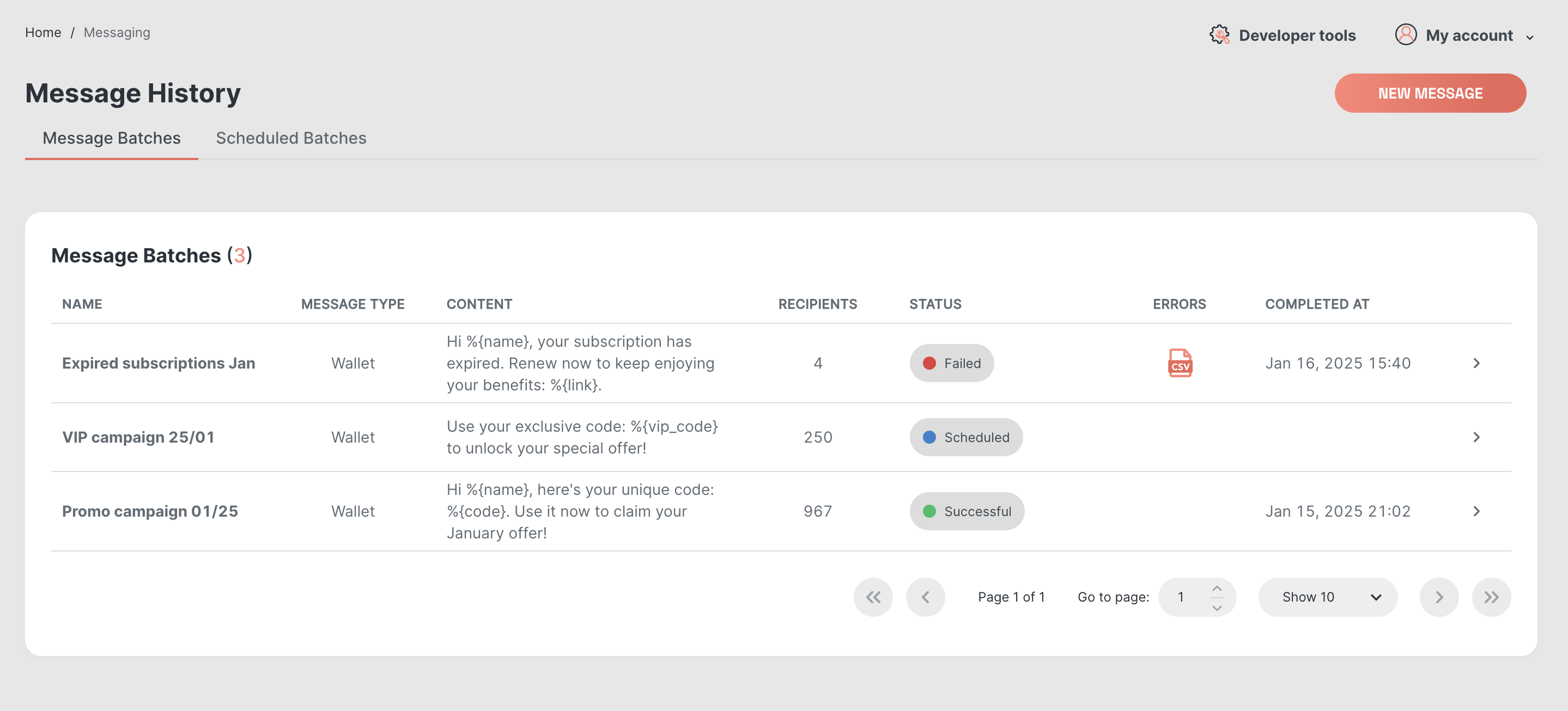Once you submit your first message batch, you can track all your batches on the Message History page, which is divided into two tabs: Message Batches and Scheduled Message Batches.- Main Information: Each batch displays key details such as the batch name, message text and type, status, and completion time.