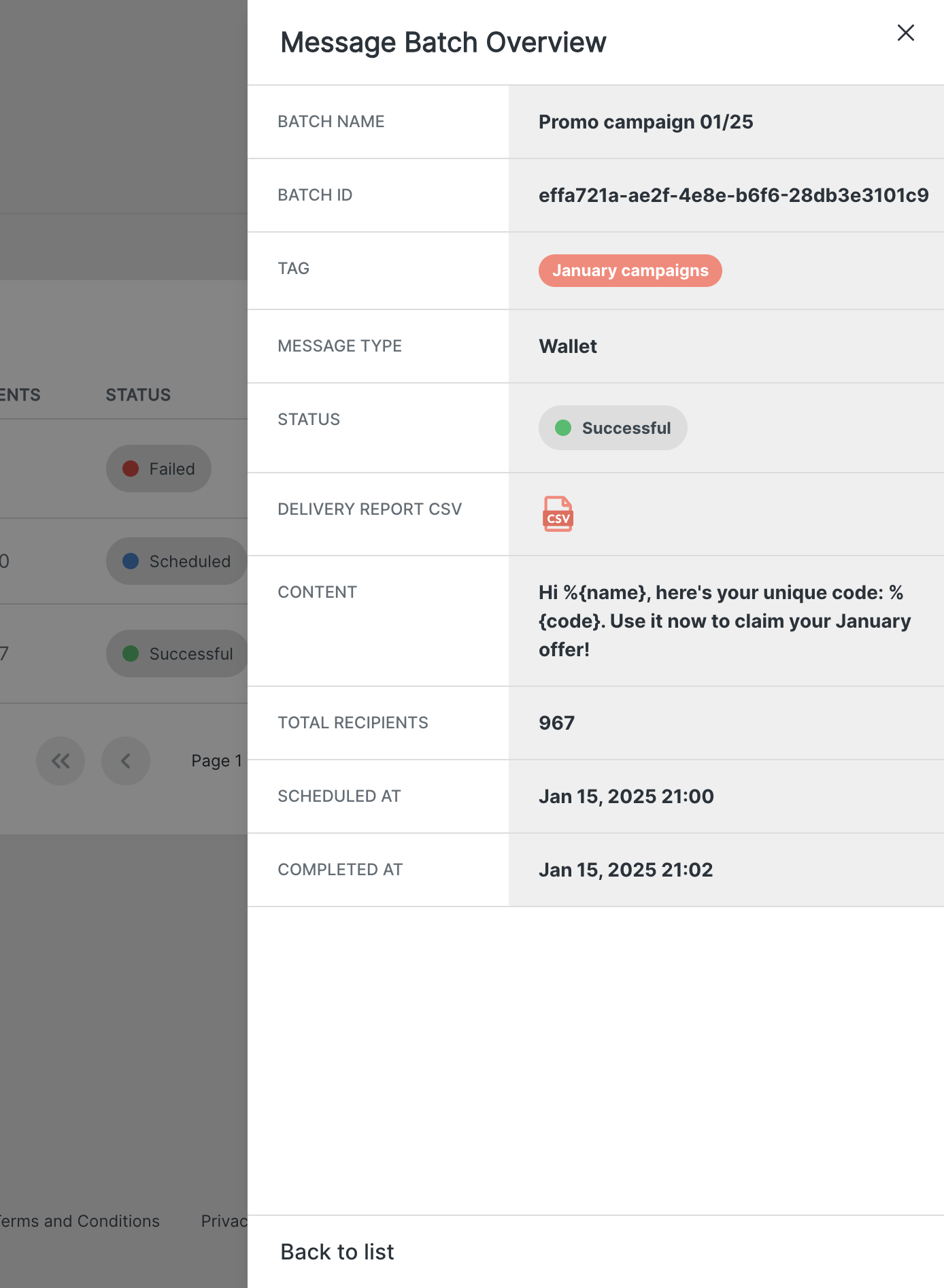 - Batch Details: Clicking the circular arrow icon will open full batch details, where you can also download a detailed delivery report, broken down by recipient and updated regularly while the messages are being sent.