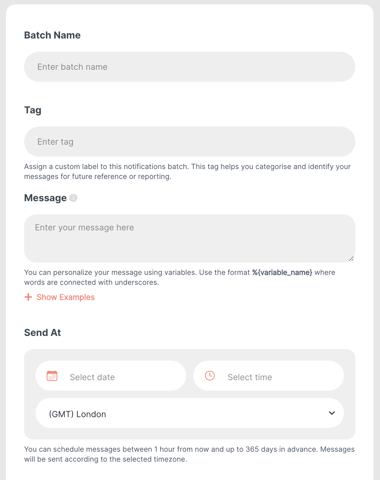 %{variable_name}that will be replaced with specific values for each recipient. Click Show Examples for help. - Send At. Required. Choose a date, time, and timezone to schedule the notifications. You can schedule messages to be sent anytime between 1 hour and 365 days in advance, making it convenient to plan campaigns.