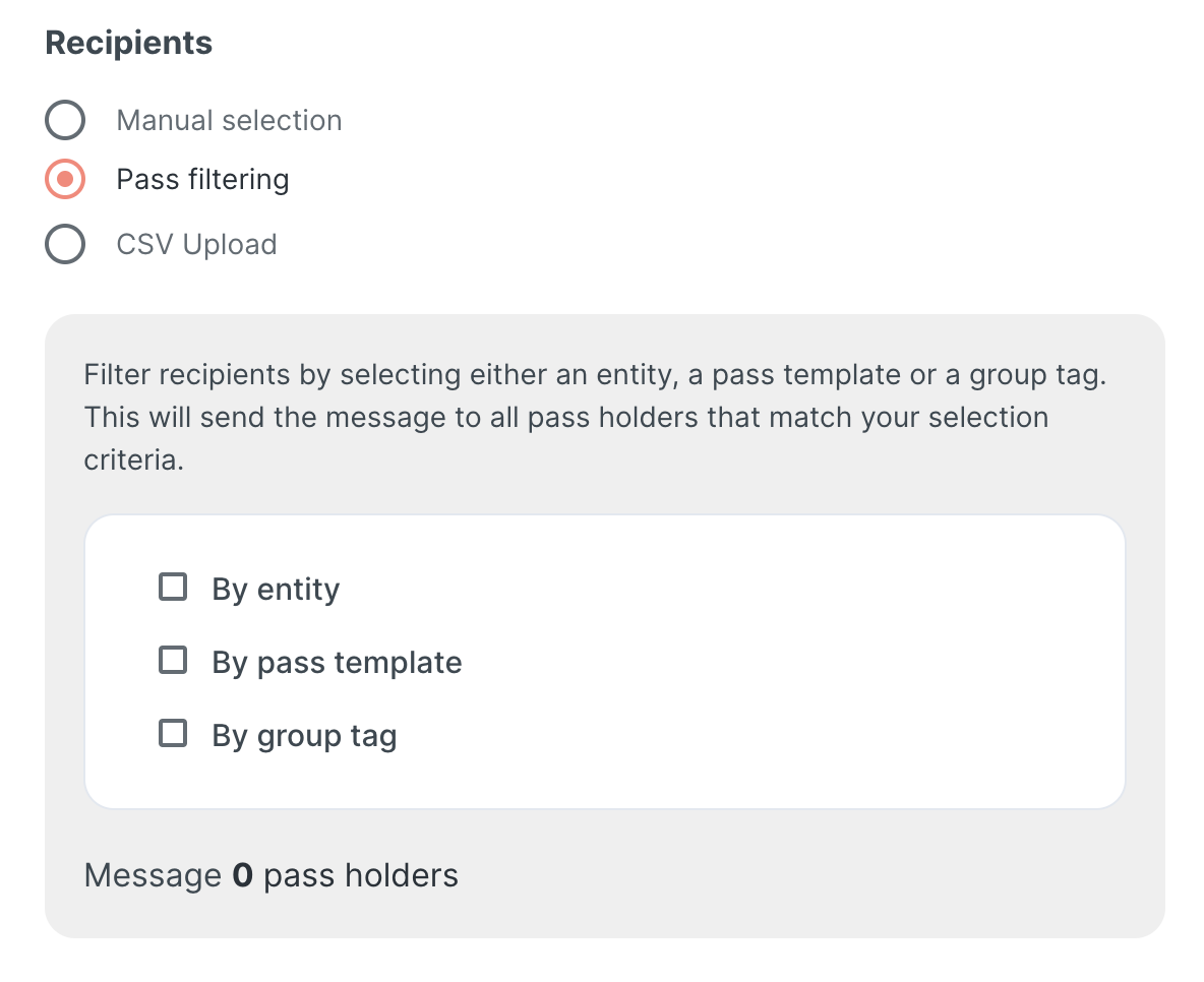 - Pass Filtering. Send messages to everyone within a specific segment, which can be entity-scoped, pass template-scoped, or group tag-scoped. The recipient counter will display how many users you’re targeting. Note that variables cannot be used in messages when using this option.