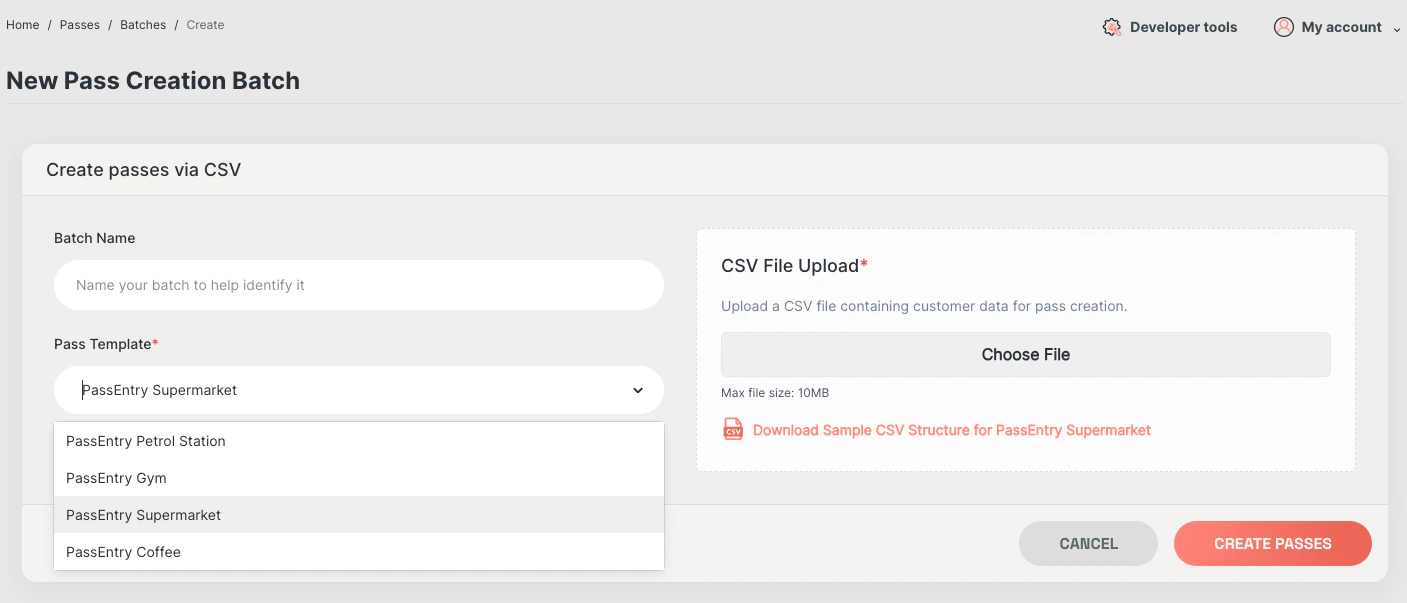 Head over to the Bulk Operations section, you will find “Create via CSV” button. Then, create a new batch. Optionally enter a batch name, and select the pass template you want the passes to be created under.