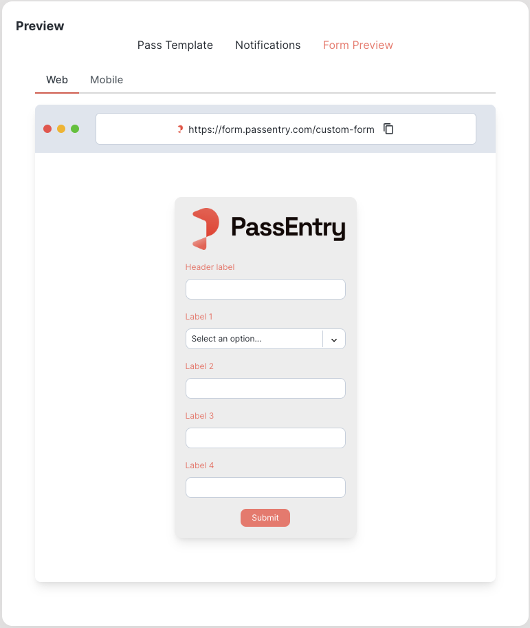 You can preview your form in real time using the preview component while creating or editing a pass template with custom forms enabled. This feature displays the URL, design elements, and form fields for both mobile and desktop browsers.