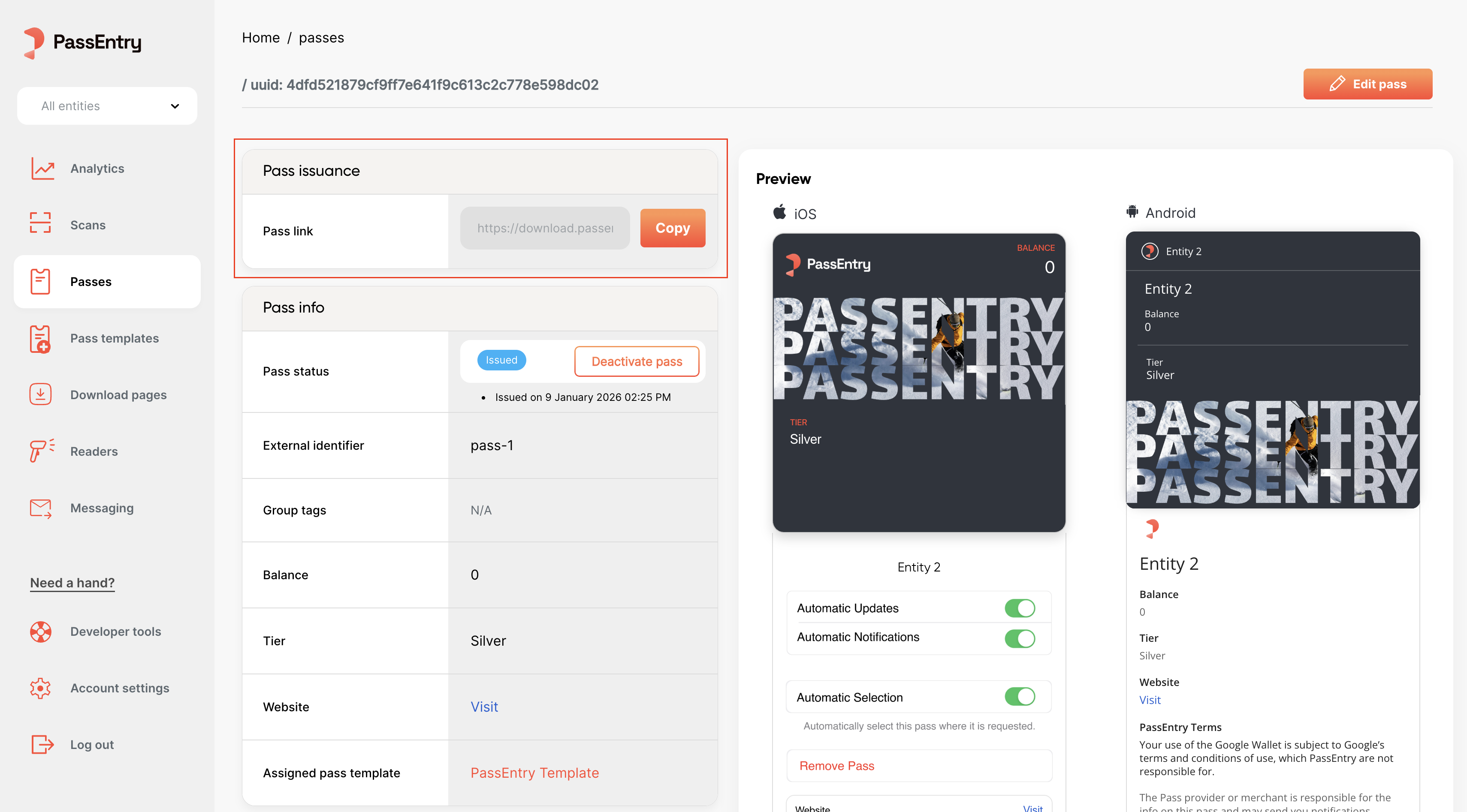 Once a pass template exists, you can issue individual passes from it.Issue a pass in the dashboard