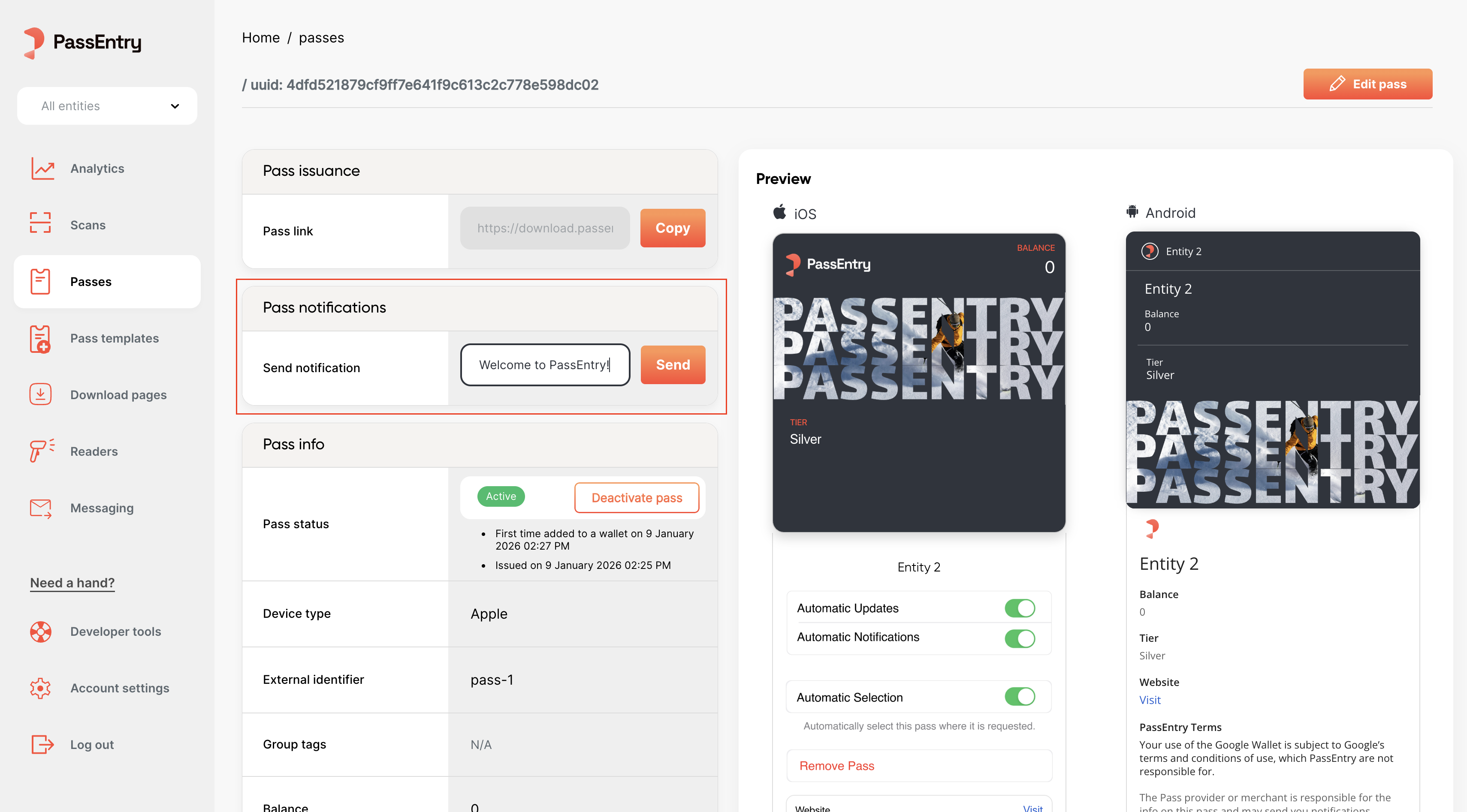 You can send notifications to pass holders to inform them about updates such as new offers, subscription expiry or balance changes. Notifications can include clickable links.Send a notification from the dashboard