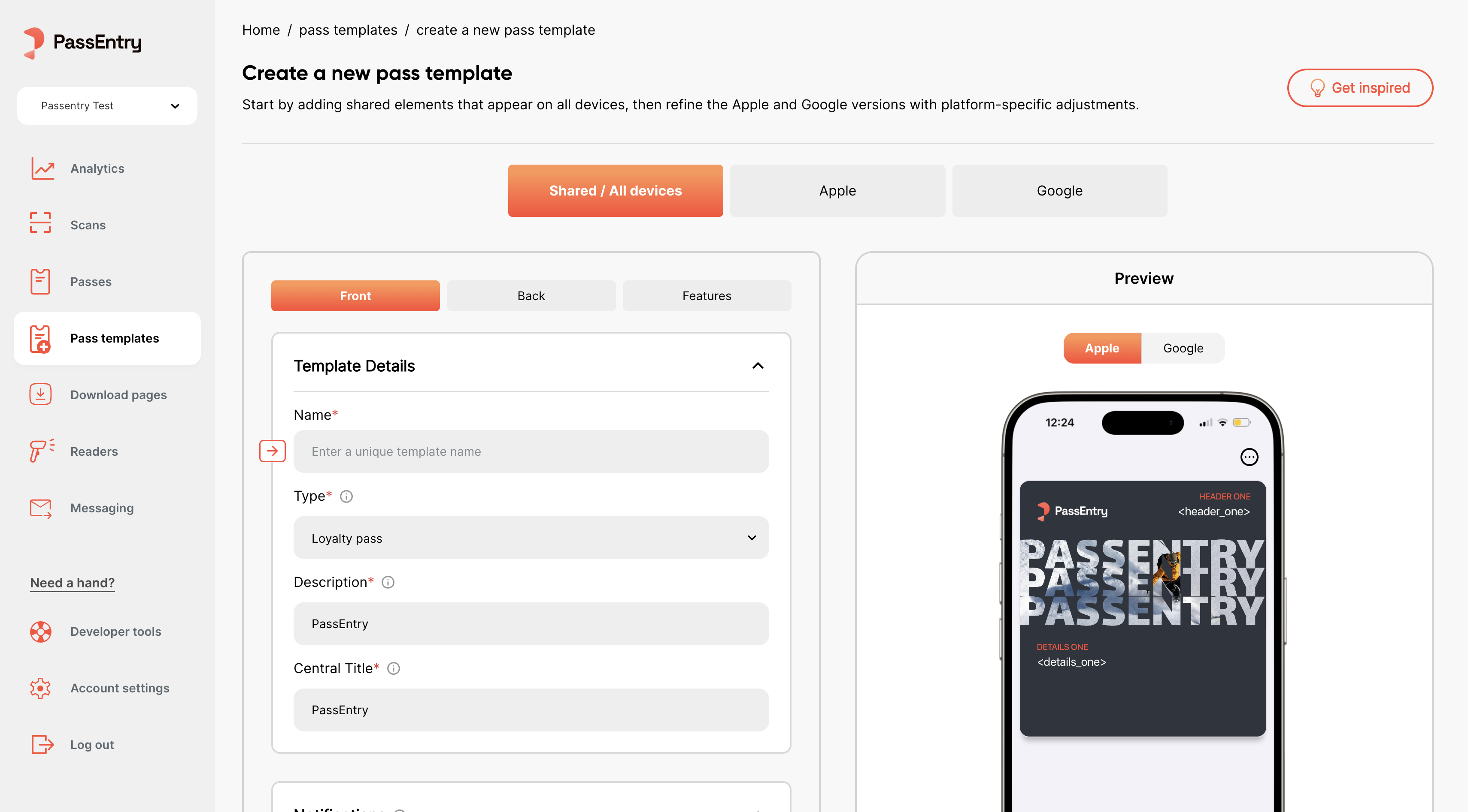 A pass template defines the structure and appearance of your passes.Create a template in the dashboard