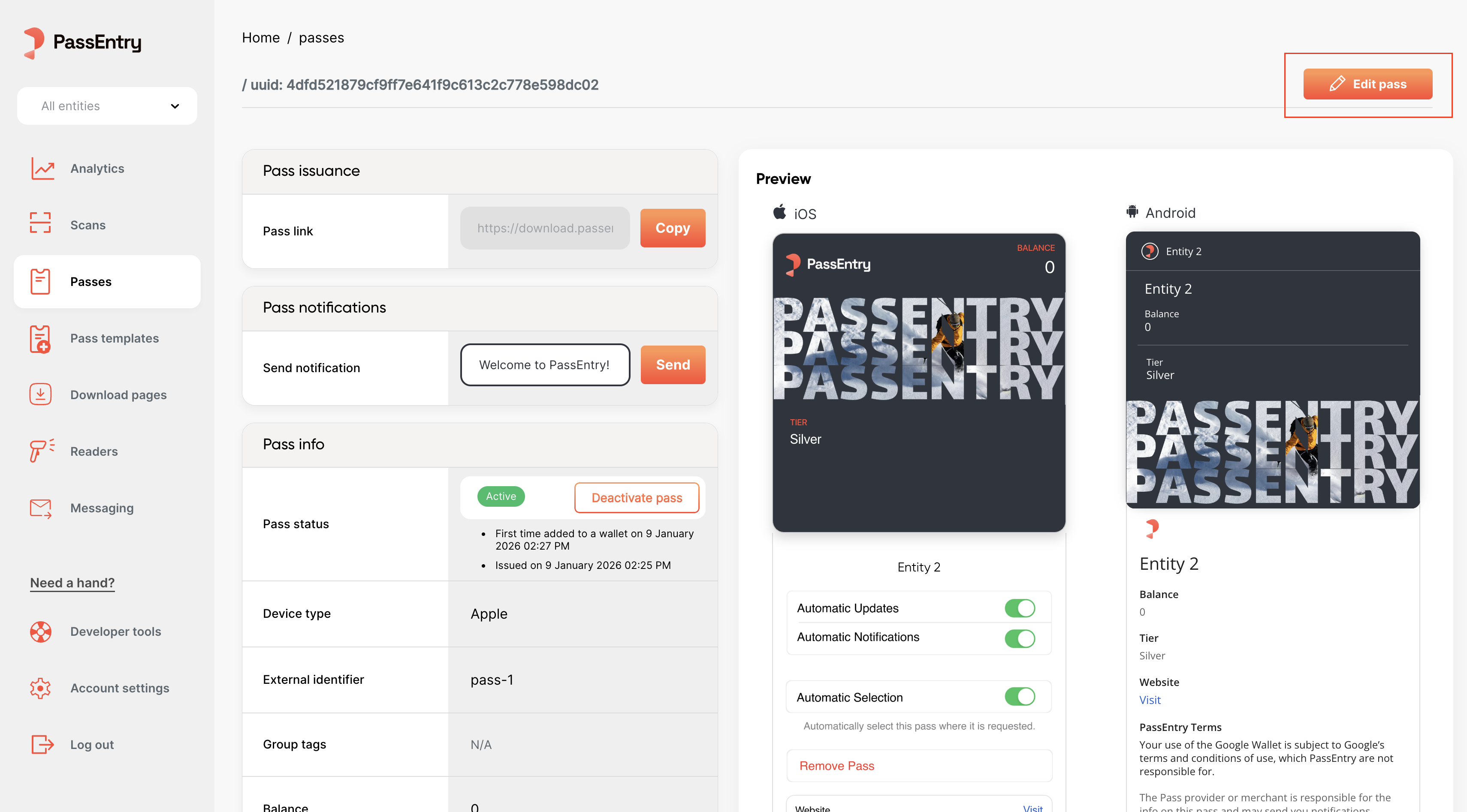 Issued passes can be updated at any time. Updates are reflected automatically in the user’s wallet — there is no need to reinstall the pass. Pass updates can be triggered in two ways:- By changing the data of an individual pass (for example: balance, tier, status)